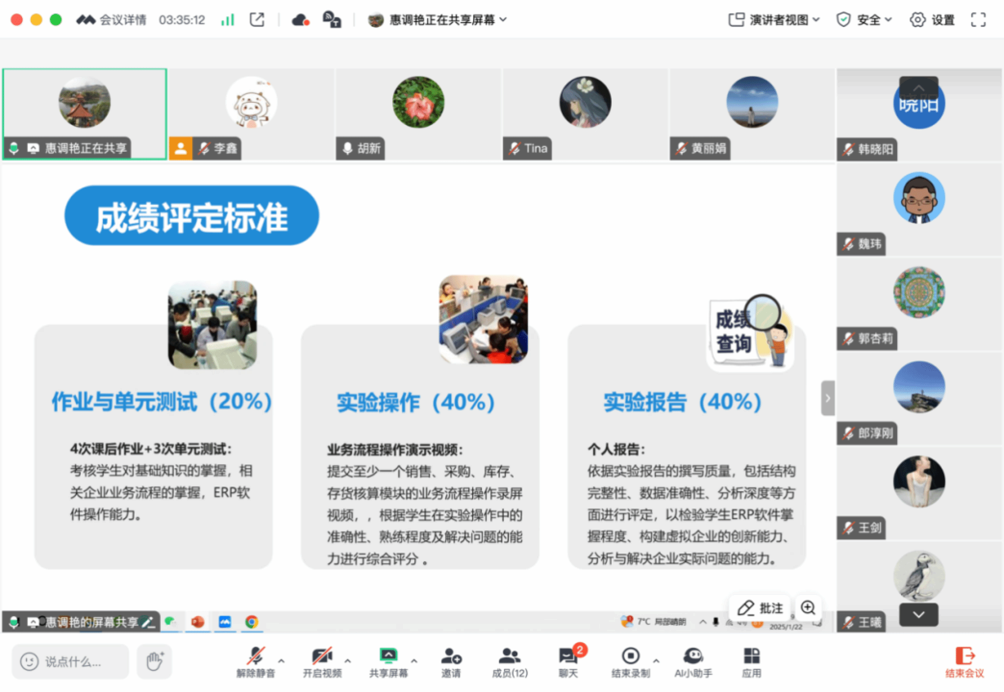 (通讯员:李鑫)1月22日上午,mjm世界杯官网中美合作办学项目举办2025年春季学期2022级中美班课程教师说课活动。本次参与说课的教师包括李光夏、周潇、韩晓阳、郎淳刚、郭杏莉、王曦、王剑、惠调艳、陈丹等9名教师(按说课顺序),胡新、魏玮、黄丽娟等3位校内外专家担任说课评审。中美合作办学项目负责人张卫莉主持本次线上说课。