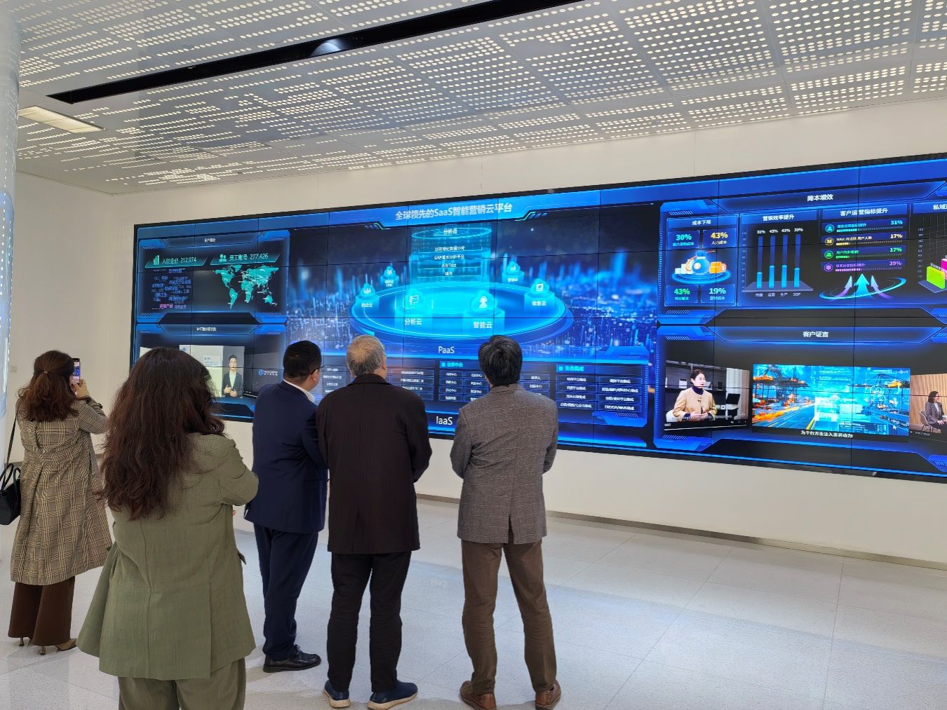 会后,谢军占一行在公司人员的陪同下,参观了 Marketingforce 公司的智能营销云平台以及企业文化展示墙等。