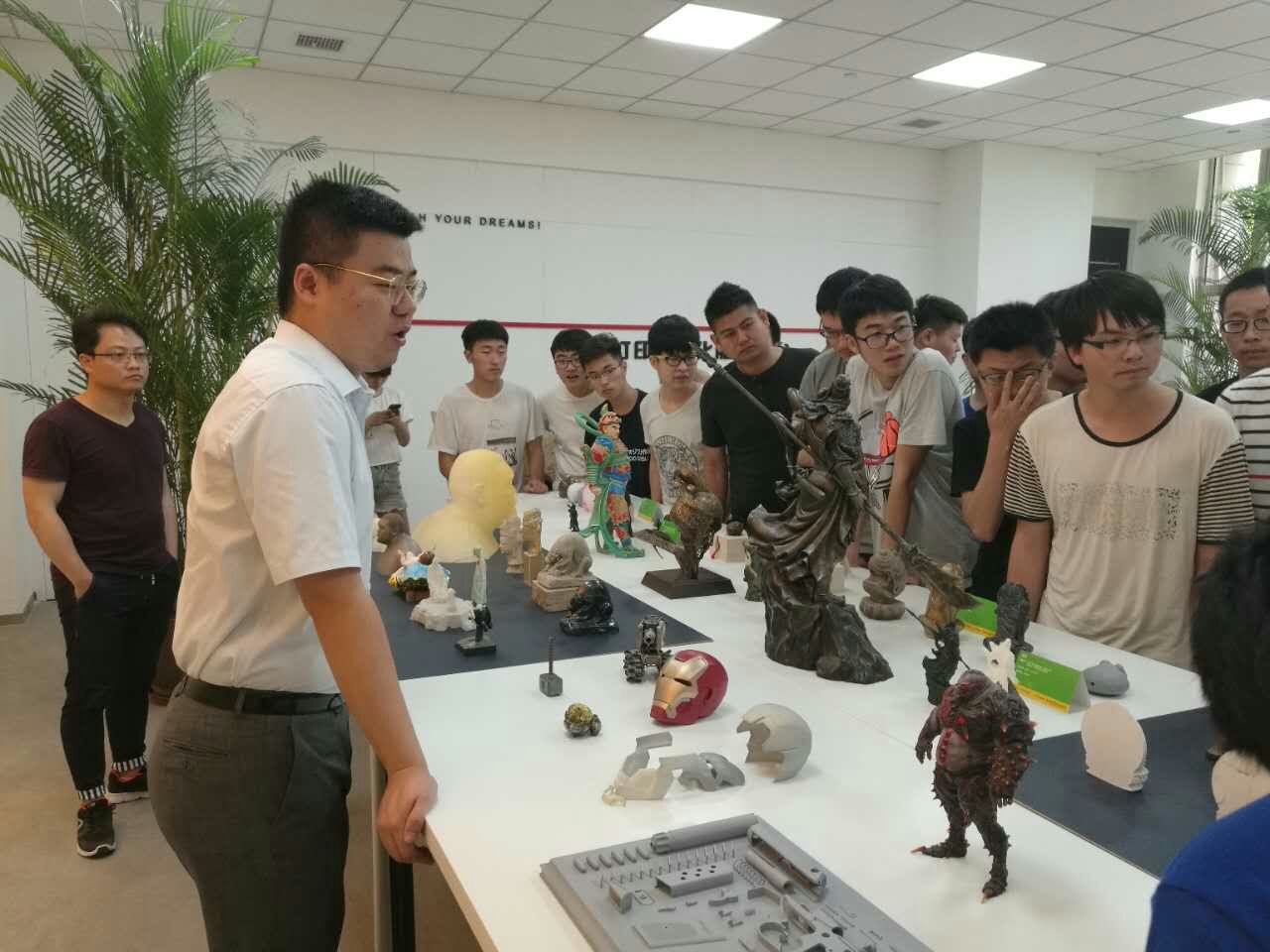 来到西安创新设计中心,同学们首先在中心负责人的带领下,参观了位于一楼大厅的一家3D打印企业的工作室,3D打印的神奇功能和展台上栩栩如生的工艺品极大地引起了大家极大的兴趣。