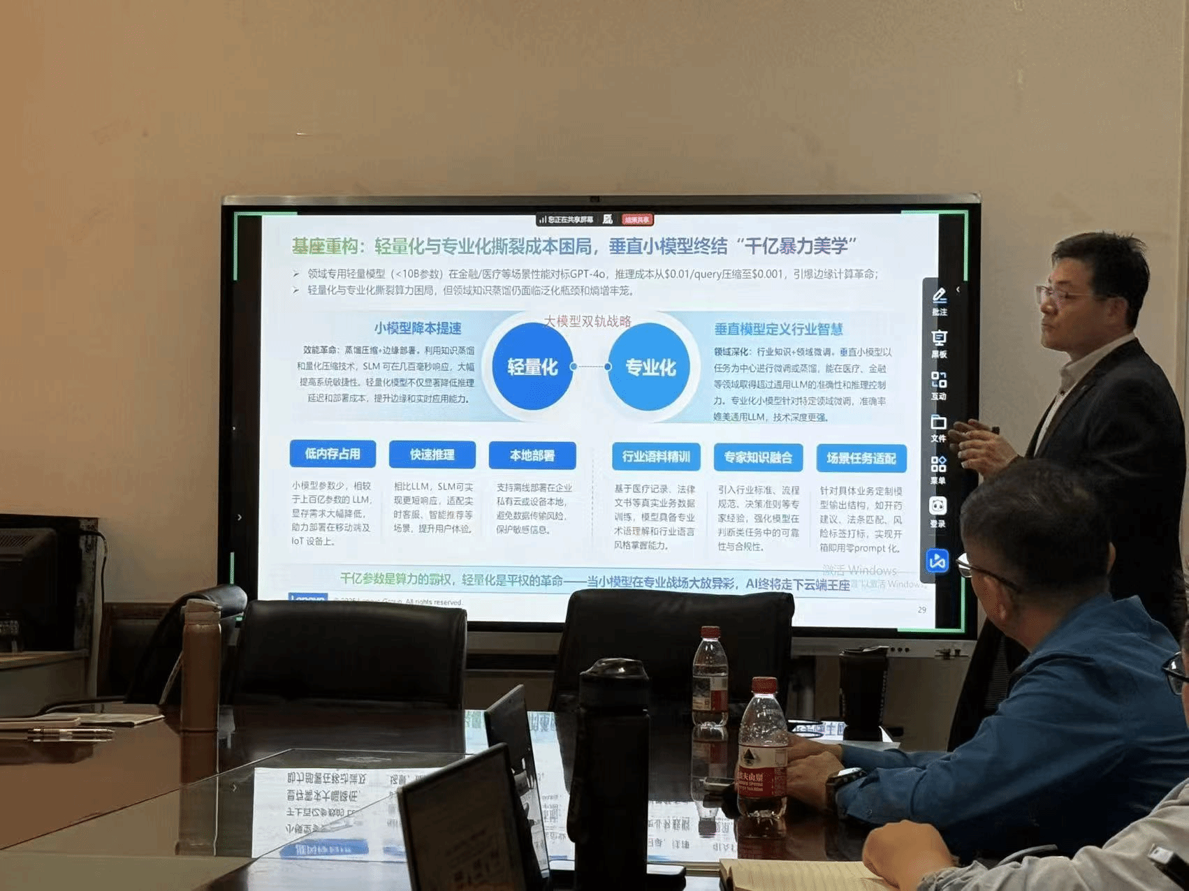 在技术层面,田野先生以联想深度参与的DeepSeek大模型为例,分享了前沿的技术突破。他讲解了混合专家模型(MoE)等创新架构如何打破传统的“缩放定律”,以更低的参数量和推理成本实现卓越性能,这种“AI时代的小米模式”正在加速AI技术的普惠化进程。他进一步强调,智能体原生架构正引发IT基础范式的变革,其核心是从传统的“数据总线”升级为“认知总线”,从“API调用”演进为“意图驱动”,这使得系统能够主动理解、预测并满足用户需求,而非被动执行命令。