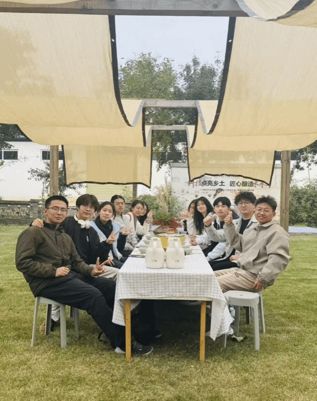 从晨光微露到日过正午,各小组的笔记本上写满了数据、故事与思考。中午,师生与村长、村支书、酱园企业代表及村民围坐在乡野天幕下聚餐,热乎的农家菜驱散了寒意,席间的交流也让调研中的细节愈发清晰——比如提到的“酱渣喂禽”循环模式,恰好为酱酿产业的联动提供了新思路。