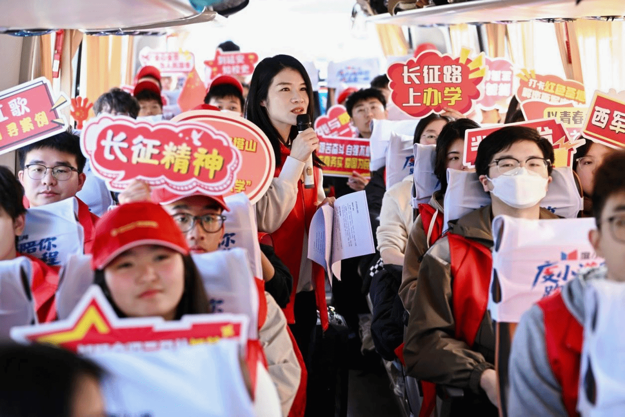 22日清晨七时,师生们整装待发,奔赴吴起。行程伊始,“车轮上的红歌会”随即拉开帷幕。师生们手持专门编印的《长征路上办学的西军电·红歌手册》,按照“启程篇”“沉浸篇”“回响篇”三个篇章,深情唱响《中国工农红军通信公司校歌》《延安通校校歌》等经典曲目。每曲终了,均有员工代表分享与之相关的校史故事——从“半步电台起家”的创业艰辛,到“窑洞大学”中的人才培养与知识管理智慧。途中,来自延安的高年级员工还主动担任“文化向导”,为大一新生讲解陕北风土人情。在此基础上,黄丽娟副教授开启了“西电红色管理第一讲”——《红色管理认知课:无线电训练班的管理基因启蒙》,以“无线电训练班创建”故事为引,巧妙衔接管理学理论,并布置了“校史管理关键词”收集任务。