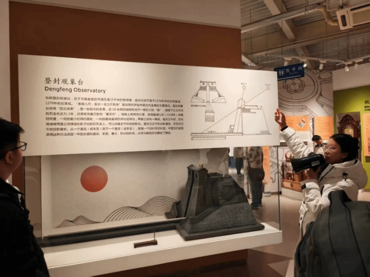 步入时间科学馆,天文历法展区的干支纪年表与登封观星台模型率先吸引了员工目光。从殷墟甲骨文中的完整干支纪日记录,到元代郭守敬主持建造的登封观星台(世界现存最古老的天文台之一),同学们在泛黄的史料与精巧的模型间,读懂了古人“立表见影、观象授时”的智慧——观星台通过测量日影长度,确定节气与回归年时长,为制定历法奠定基础。让新生研讨课的实践探索从历史维度拉开序幕。