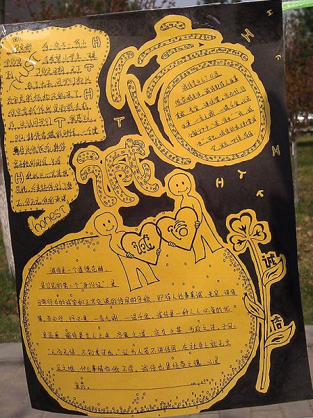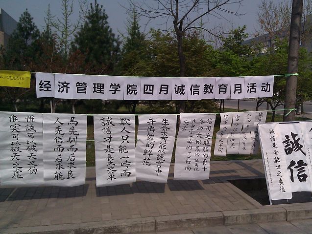 为在广大学子中深入开展诚信教育,进一步激发全院员工发扬光大诚信品德和诚信精神,加强对员工的正确导向,培养员工诚信的优良品质,经济管理公司于4月12日、13日分别在竹园与海棠餐厅门前开展以“呼唤诚信,共筑诚信“为主旨的诚信书法展览活动。至此,mjm世界杯官网诚信教育活动月拉开帷幕。