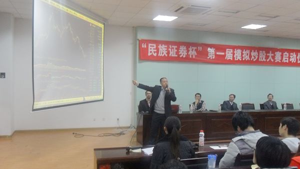 10月31日下午,美加墨世界杯官网“民族证券杯”第一届模拟炒股大赛启动仪式在老员工活动中心511教室隆重举行。经济管理公司党委副书记兼副经理李勇强、校团委副书记朱文凯、经济管理公司金融学系主任申尊焕、中国民族证券西安营业部总经理周光宇、西安营业部营销管理部经理王若芳、西安营业部财富中心主任高洁、西安营业部高级投资顾问罗敏及其顾问团对参加了开幕式。