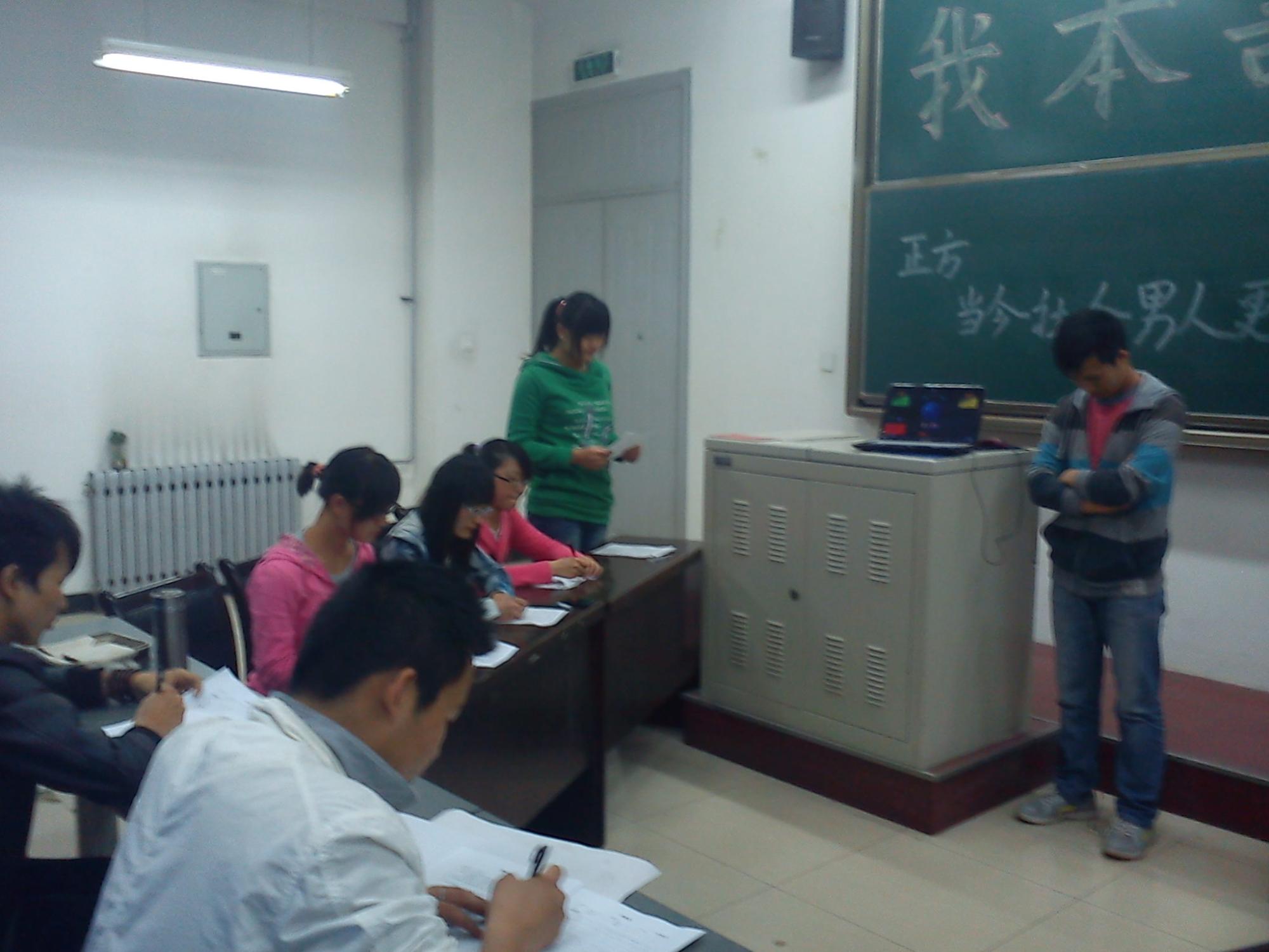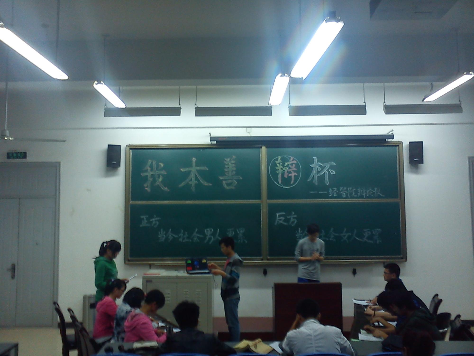 2012年4月11日星期三,晚七点半,由经济管理公司辩论队与2011级各宿舍联合举办的“第九届我本善辩杯”辩论赛复赛第一场正式开赛,此次辩论赛在B421举行,到场的评委是2010级员工段亚强、卓德义、袁雪艳。本次辩题是“当今社会,男人更累还是女人更累”,正方辩手是504宿舍的董晨露、聂耀男、王蕾、龚敏同学,她们的观点是“男人更累”,反方辩手是201宿舍的王鹏、范云涛、梁磊、王和全同学,他们的观点是“女人更累”。