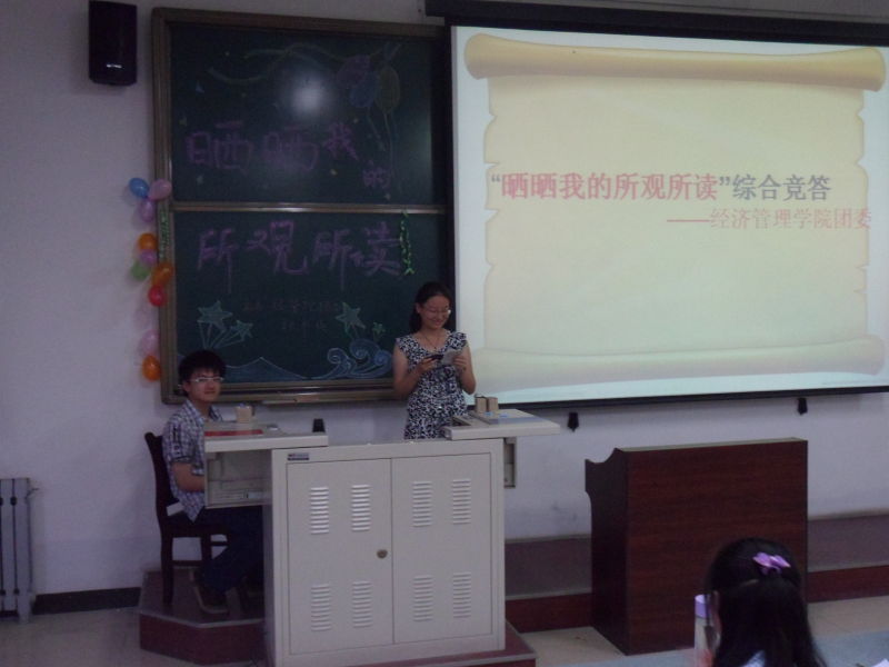 2012年5月8号晚,在B楼303室,由经济管理公司团委主办的“晒晒我的所观所读”活动在一片欢愉的气氛中举行。此次活动紧随第27届校园文化艺术节的步伐,响应其营造和谐积极的校园氛围、增强青年员工的文化意识的号召,通过同学们准备读书观影内容,参加活动中的知识竞答,让同学们更加深刻的理解“文化”的含义。