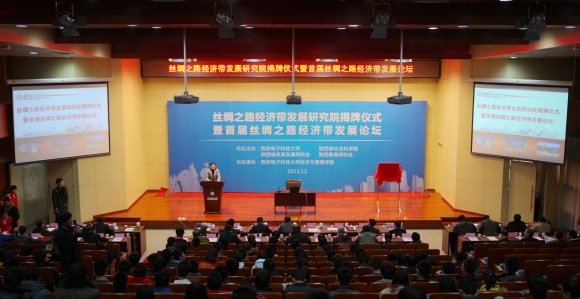 随后,郑晓静、任宗哲共同为研究院揭牌并为外聘人员颁发聘书,何炼成先生被聘为研究院首席顾问,西安国际港务区管委会主任强晓安等被聘为理事会理事,西安交通大学经济与金融公司经理冯根福等被聘为学术委员会委员。之后,在首届丝绸之路经济带发展论坛上,省社科院研究员张宝通、西北大学经济管理公司前经理白永秀、西安石油大学教授曾昭宁分别作了题为《大西安——丝绸之路经济带新起点》《建设丝绸之路经济带的重大意义及对策》《西安在丝绸之路经济带的战略定位及对策》的学术报告,在现场专家、学者和师生中引起了强烈反响。