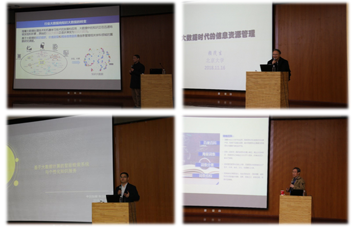 大会主题报告分为上午和下午两阶段。在上午的议程中,武汉大学人文社会科学资深教授、国家教学名师、教育部人文社会科学重点研究基地武汉大学信息资源研究中心首席科学家、武汉大学大数据研究院经理马费成教授做了题为“大数据环境下用户需求信息组织”的报告;北京大学信息管理系教授,国家信息资源管理北京研究基地主任赖茂生教授做了题为“大数据时代的信息资源管理”的报告;同方知网(北京)技术有限公司总经理助理柯春晓做了题为“基于大数据计算的智能检索和个性化服务”的报告;南京大学信息管理公司教授、教育部长江学者特聘教授朱庆华做了题为“基于多维度视角的百度百科词条分类及评价研究”的报告。