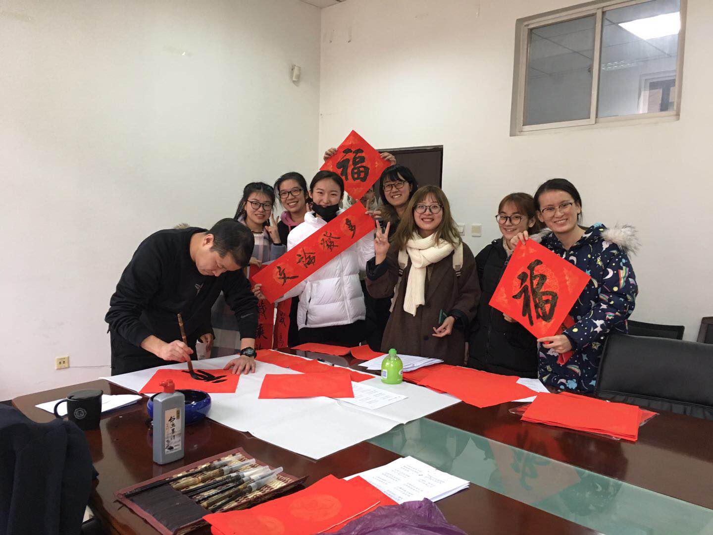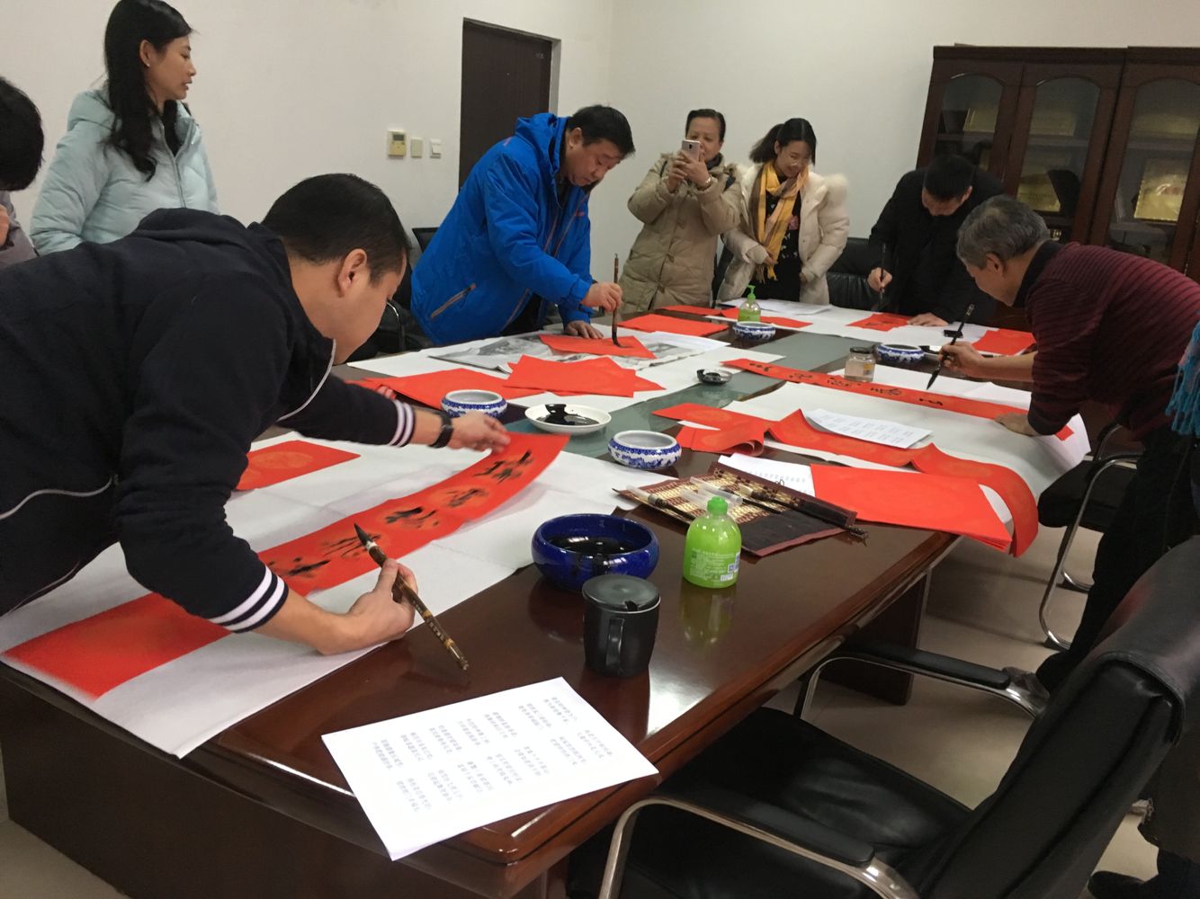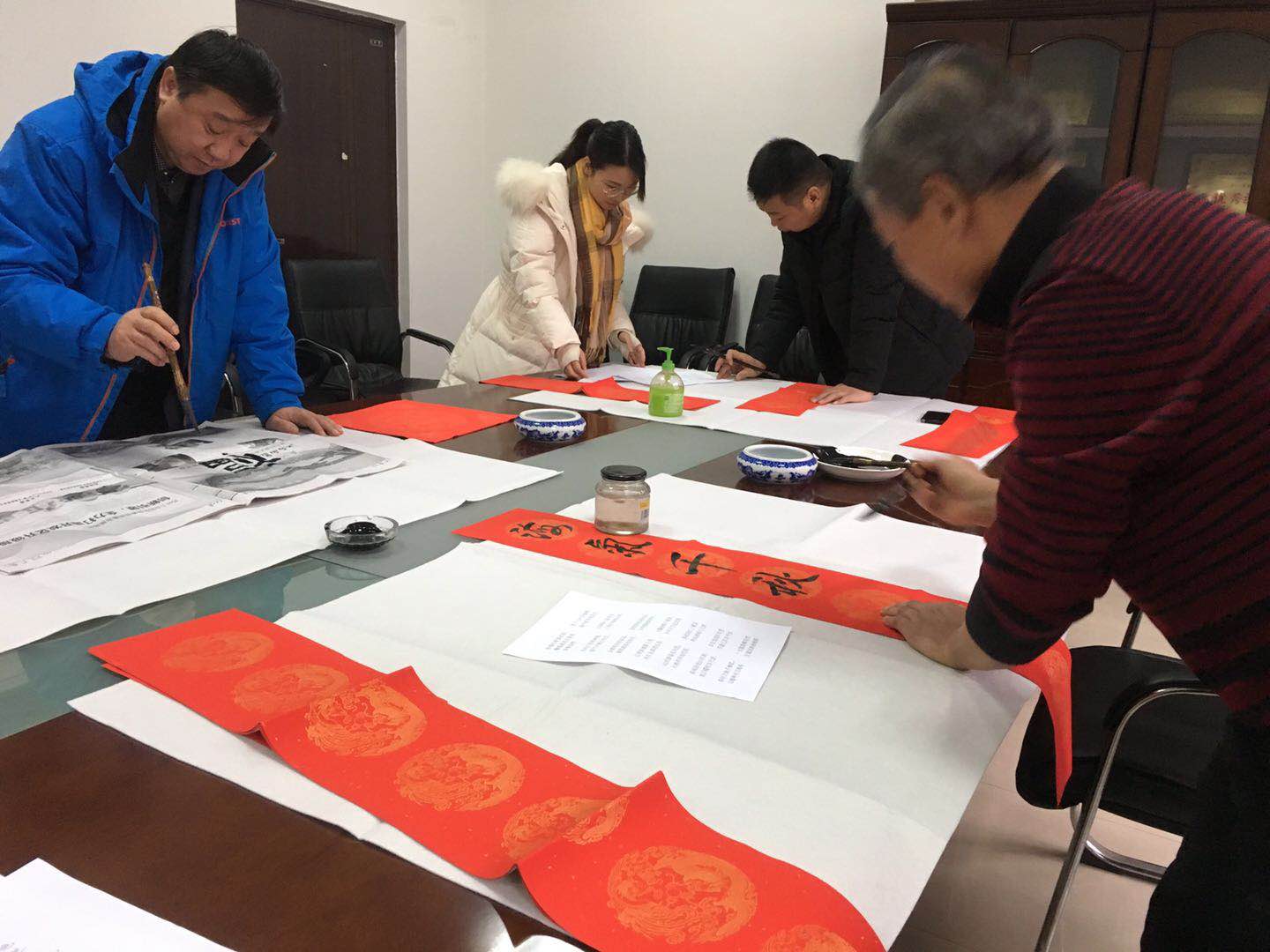 一大早,南校区信远楼二区332就已经热闹起来,大大的会议圆桌上,摆放好了毛毡、和笔墨纸砚等用品,李耀平书记邀请了西安市灞桥区文化馆馆长史兴海老师、公司杜跃平老师和耿老师来为全院师生写春联。