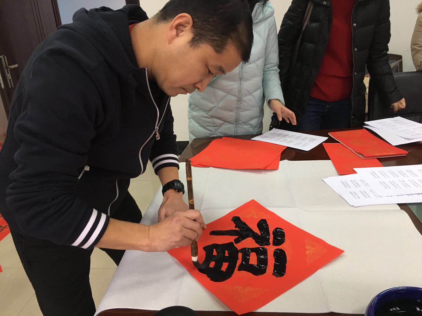 几位老师挥毫泼墨,不一会儿地上就摆满了对联。公司的老师员工都来到办公室,一边观看老师的书法,一边挑选对联,还有老师选好了内容,向几位老师求对联。几位老师也是欣然接受了请求。请对联和“福”字的老师越来越多,对联也是“供不应求”。