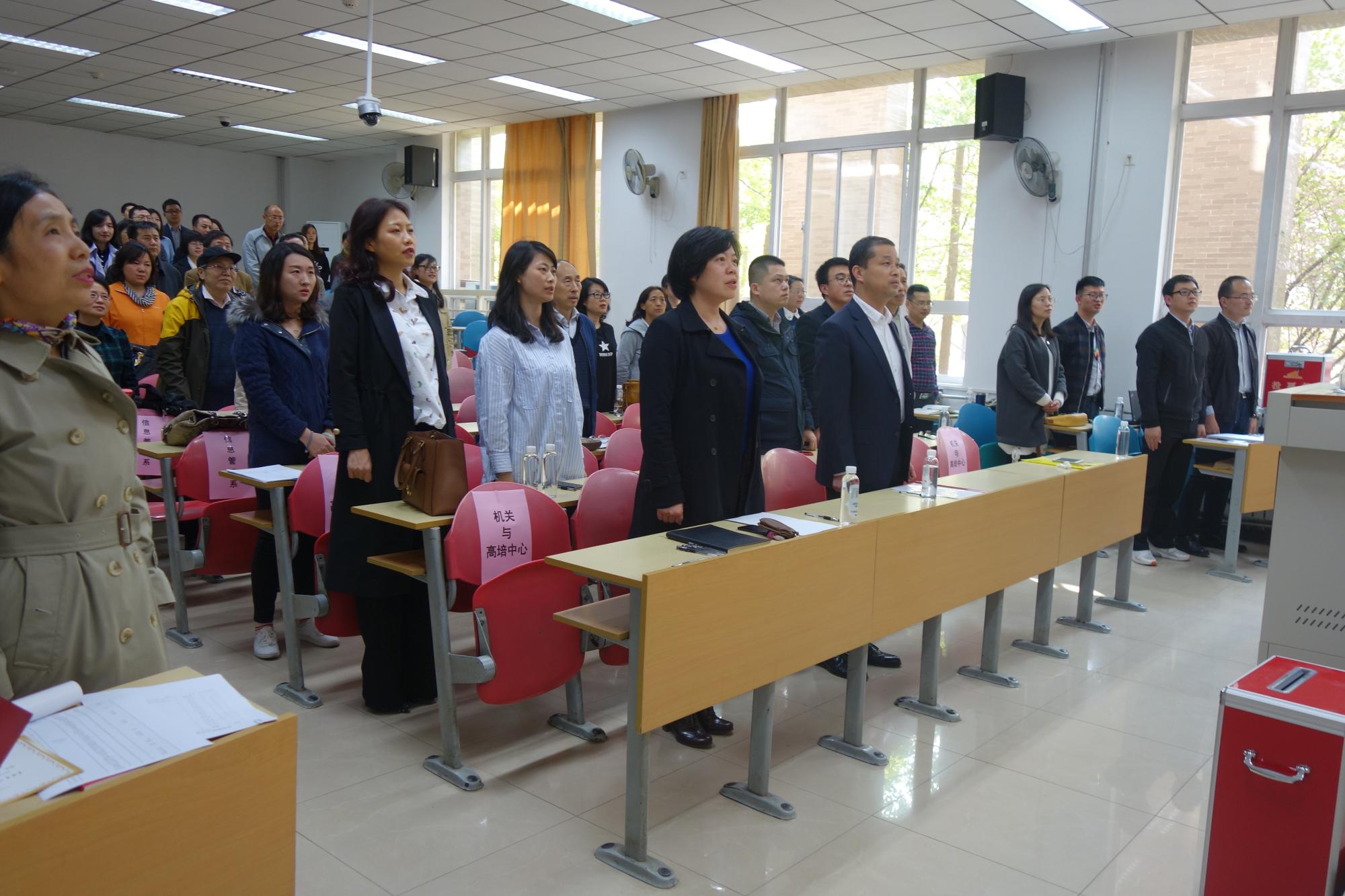 大会开始,在雄壮的乐曲声中,全体起立,高唱《中华人民共和国国歌》。