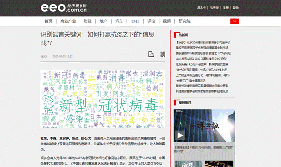 文章从前段时间“全民‘疯抢’双黄连口服液”入手,基于腾讯辟谣平台“较真”2月8日到15日列出的谣言和伪科学虚假信息,用计算机软件做了数据提取识别关键词,分别使用图的排序的TextRank算法和词频与逆向文件频率综合的IF-IDF算法进行数据分析,分别获得了“病毒、口罩、武汉”和“冠状病毒、新型” 等40个关键词,获得词云图,并得出谣言具有重要性、敏感性、模糊性等三点构造特征。基于以上分析,文章指出那些没有引用参考出处、满屏宣泄情绪和观点、没有事实和论据的文章,往往会成为谣言和虚假消息的来源,进而得出要打赢抗击谣言和虚假信息的“信息战”,必须提升民众的知识储备和理性判断能力的论断,呼吁广大民众用知识和理性武装自己,打一场抗击谣言和虚假信息的“信息战”。文章经刊发,获得新浪财经、搜狐网、大风号等知名媒体的转载。