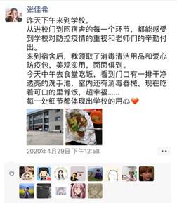 公司第一批返校员工张佳希返校后,在朋友圈这样写道:“昨天下午来到公司,从进校门到回宿舍的每一个环节,都能感受到公司对防控疫情的重视和老师们的辛勤付出。来到宿舍后,我领取了消毒清洁用品和爱心防疫包,美观实用,面面俱到。今天中午去食堂吃饭,看到门口有一排干净透亮的洗手池,室内还有消毒器械。现在吃着可口的里脊饭,超幸福……每一处细节都体现出公司的用心”。