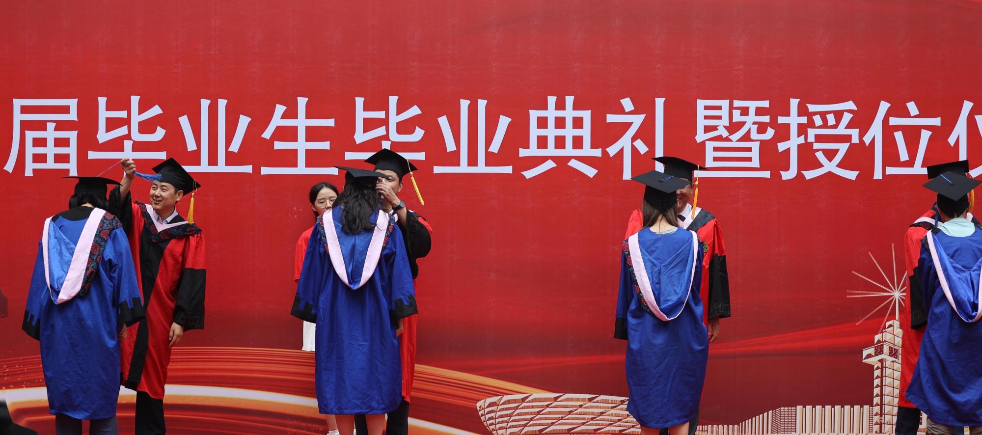 在授位环节中,伴随着舒缓的音乐声,毕业生依次上台,授位嘉宾与他们亲切握手,拨正学士帽上的流苏,递上寒窗苦读取得的学位证书。毕业生们接过证书,回忆起求学路上的点点滴滴,站在亲切的导师身旁,面对镜头绽开一个最完美的微笑。
