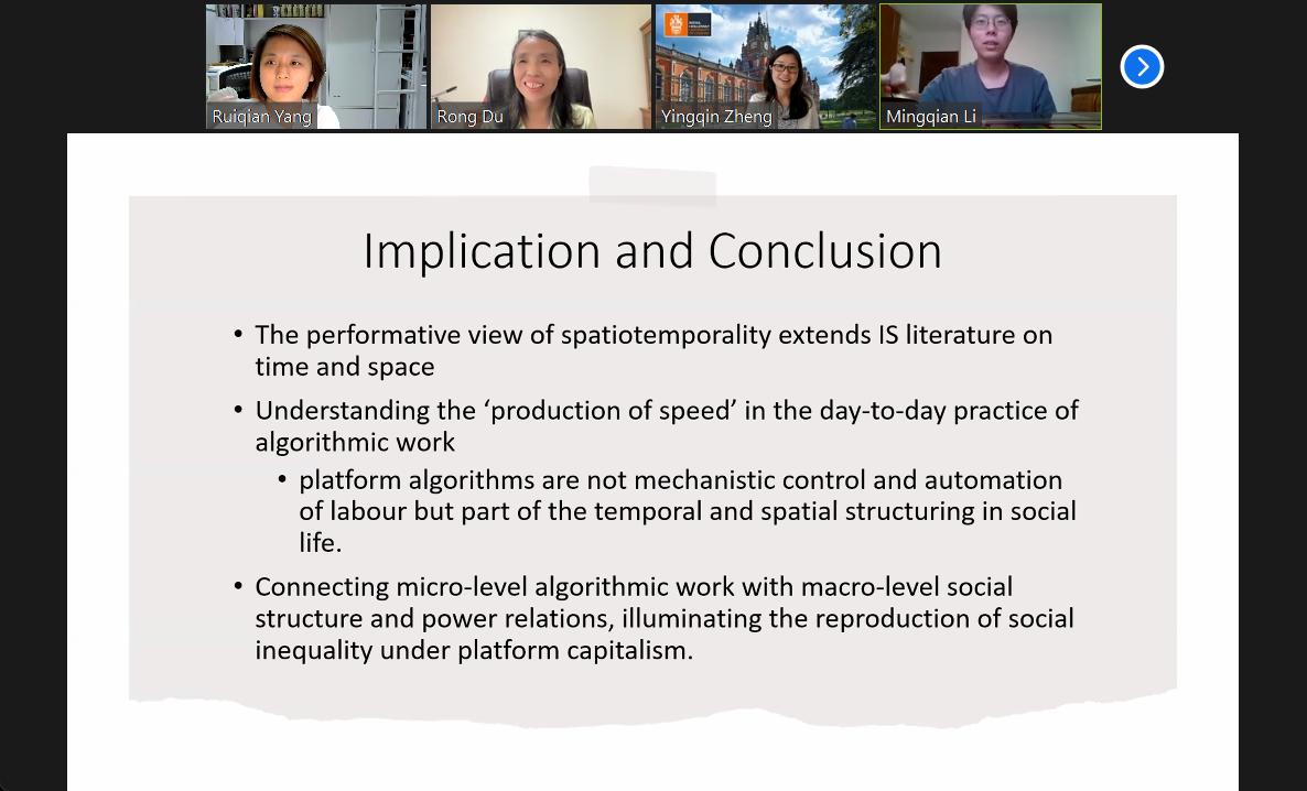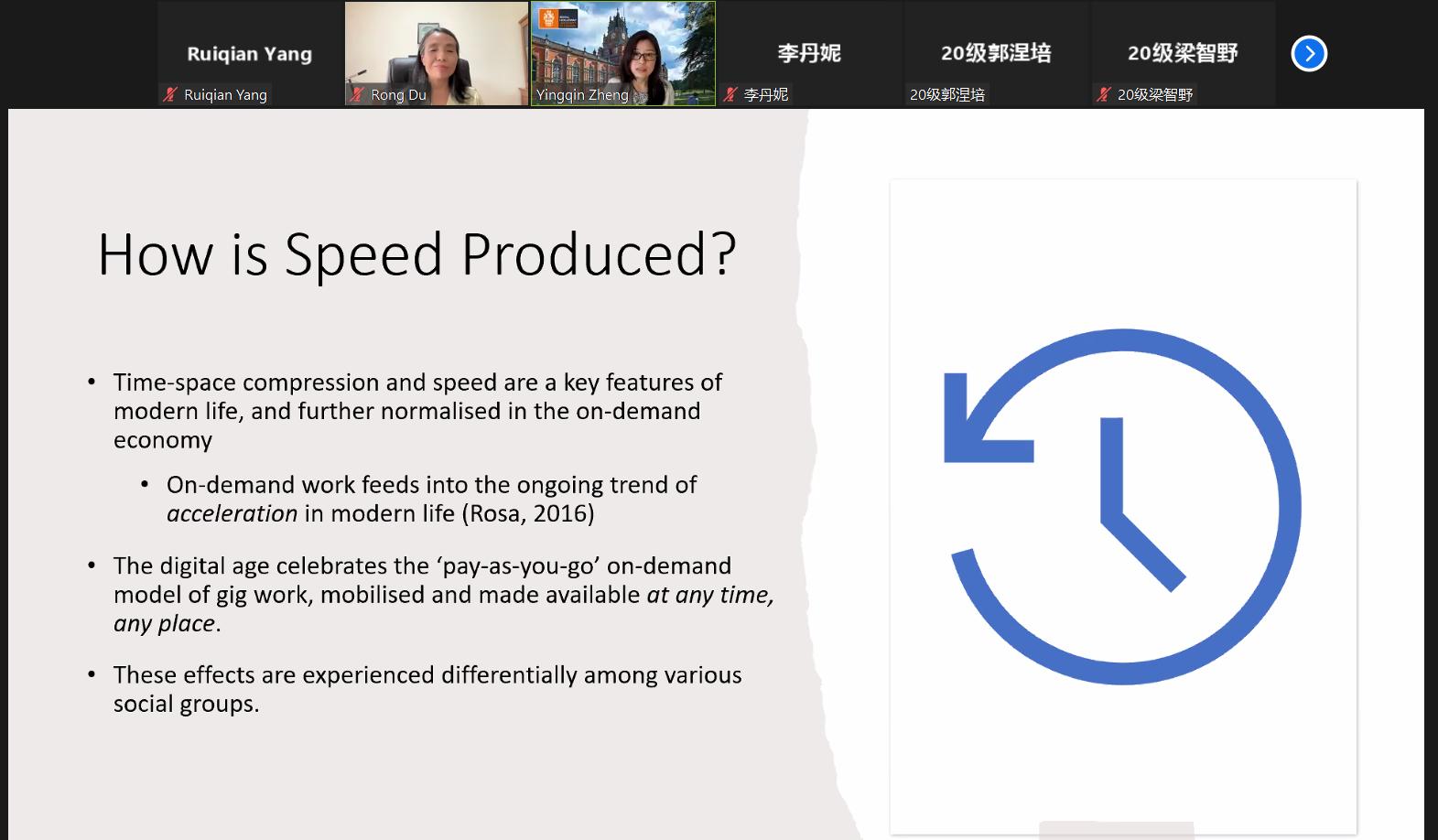 Yingqin Zheng博士在报告会上从四个角度深入地解释了时空性的概念,并通过对中国送餐员的定性研究分析了骑手工作的多重时空性,来解决按需经济中的“速度”问题,并提出了一个关于时空的表演性观点,以说明多种时空秩序的重新配置,为与会人员提供了一个新思路。
