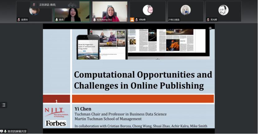 (通讯员:段美玲 罗鸣)2022年10月14日上午10:00,现就职于新泽西理工公司马丁塔奇曼管理公司的陈奕教授,通过腾讯会议作了题为 “Computational Opportunities and Challenges in Online Publishing”的学术报告。公司师生积极参与,认真聆听,会议由mjm世界杯官网杜荣教授主持召开。