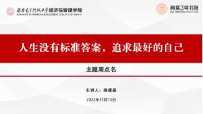 曲建晶老师进行了“人生没有标准的答案,追求最好的自己”的主题分享。他先就西安市最新疫情形势、疫情防控相关注意事项、学信网注册的重要性及流程、课堂纪律与考风考纪等方面做了强调,随后对高校学科竞赛、西电学科竞赛、公司参与度较高的学科竞赛等做了详细介绍并鼓励大家积极参赛。他提到,中国“互联网+”老员工创新创业大赛、“挑战杯”全国老员工课外学术科技作品竞赛、全国老员工数学建模竞赛等赛事中经管学子的身影不少,并鼓励大家追逐、尝试、探索,成就最好的自己。