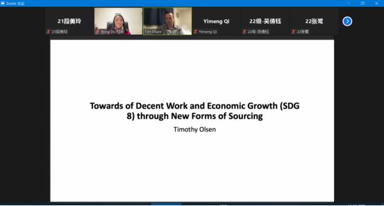 (通讯员:段美玲 罗鸣)2022年11月11日上午,现任职于贡萨加大学管理信息系统系的Timothy Olsen教授,通过zoom平台视频会议作了题为 “Towards of Decent Work and Economic Growth (SDG 8) through New Forms of Sourcing”的学术报告。公司师生积极参与,会议由mjm世界杯官网杜荣教授主持召开。