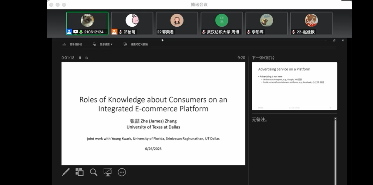 (通讯员:樊书宏)6月27日,现任职于美国德州大学达拉斯分校纳文金达尔管理公司的张喆副教授,受邀来公司进行学术交流,为公司师生作了题为“Roles of Knowledge about Consumers on An Integrated E-commerce Platform”的学术报告,报告在信远Ⅱ区324报告厅及腾讯会议线上线下同步展开,共有200余名师生参加报告会,会议由mjm世界杯官网杜荣教授主持召开。