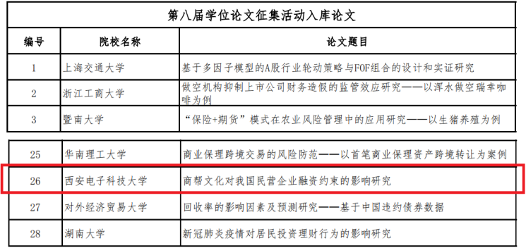 (通讯员:刘洋 罗鸣)日前,全国金融专业学位研究生教育指导委员会公布了第八届全国优秀金融硕士学位论文评选结果,由公司康晓玲副教授指导的2018级金融硕士研究生李嘉威撰写的学位论文《商帮文化对我国民营企业融资约束的影响研究》从众多参赛论文中脱颖而出,获评全国优秀金融硕士学位论文(详见http://www.pdf.org.cn/homepage/news/430)。