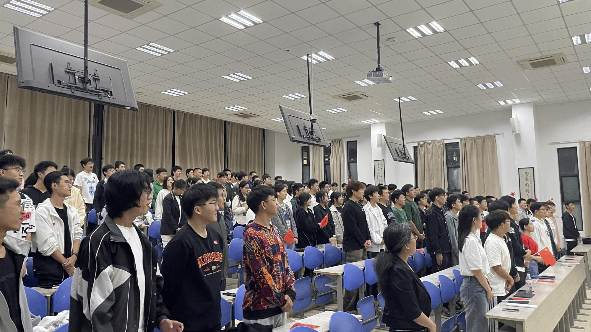 文世龙老师首先向同学们介绍了从民歌到红歌的发展历史,并向同学们教授了一些经典曲目,在演唱方法、停顿时间、感情表达等方面做了细致的指导,还演示了陕北秧歌的跳法。《山丹丹开花红艳艳》、《兰花花》、《拥军花鼓》、《黄河大合唱》、《南泥湾》、《兄妹开荒》等经典的旋律在B-538的教室里一次次响起。最后,与会师生全体起立,大家手挥国旗、齐声合唱《我和我的祖国 My Motherland and I》,活动在嘹亮的歌声中落下帷幕。