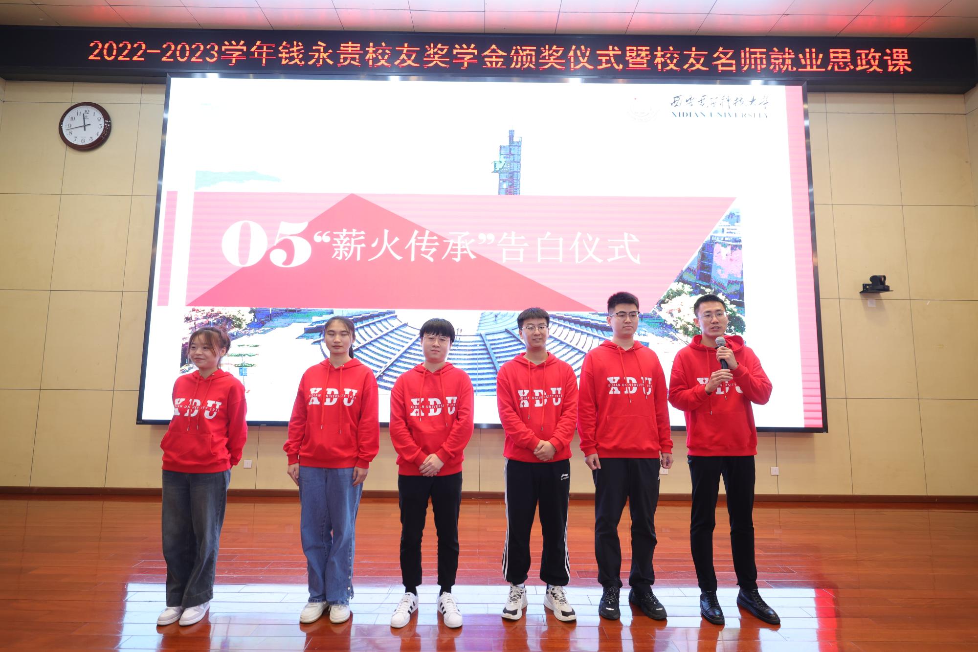 在随后的颁奖环节,院团委负责人刘越宣读2022~2023学年钱永贵员工奖学金获奖名单,钱永贵、王卫东、韩鹤林分别为获奖员工颁奖并合影留念。伴随着深情音乐,“薪火传承”告白仪式正式启动,首先播放了往届钱永贵员工奖学金获奖代表的告白视频,现场领奖员工代表接过告白棒,站在报告台上深情告白钱永贵员工并庄严宣誓,散坐在观众席中的往届获奖员工代表也发表了他们的告白宣言,表示自己一定努力进取,积极向上,努力为国家和社会的发展贡献自己的力量,请党放心,请钱总放心。现场氛围到达了高潮。