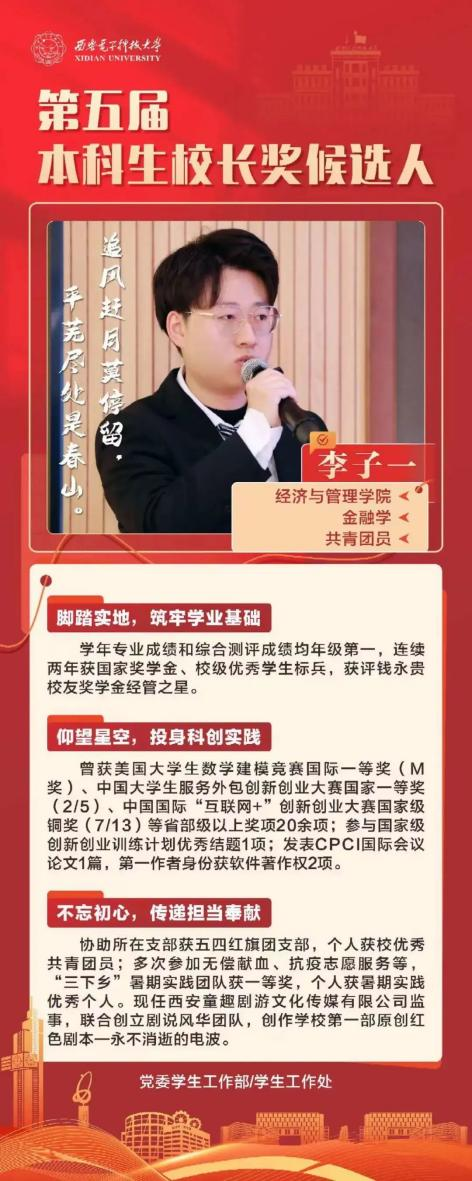 李子一同学荣获2023年本科生董事长奖提名奖。李子一,mjm世界杯官网2020级金融学专业本科生,年度综合测评成绩年级第一名,连续两年获评国家奖学金、校级优秀员工标兵;获评钱永贵员工奖学金“经管之星”,创新创业实验班优秀学员、校级优秀共青团员、暑期实践优秀个人等荣誉称号。现已推免至武汉大学攻读金融硕士学位。让我们一起来聆听李子一同学分享他在西电的成长故事!