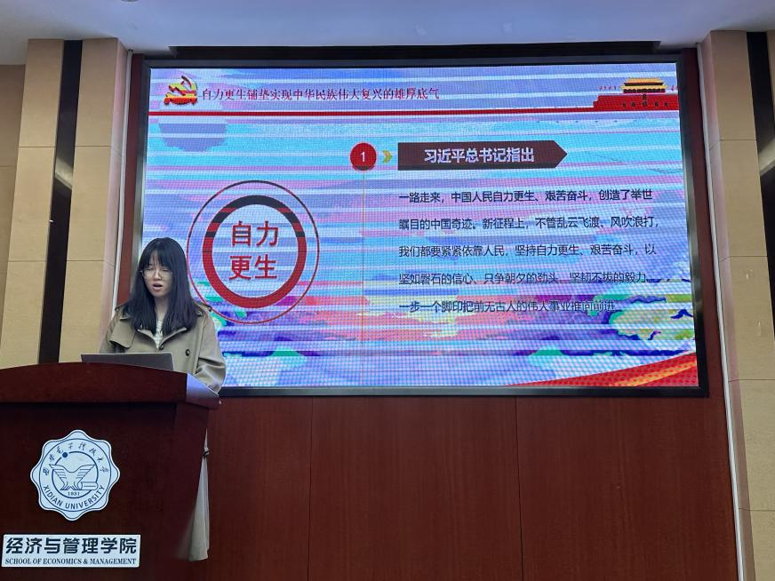 计算机科学与技术公司的王蔚延同学作了题为《自力更生精神》的宣讲,王蔚延同学讲述了三个方面的内容。第一,自力更生贯穿我们党领导革命、建设、改革的长期实践:自力更生是中华民族自立于世界民族之林的奋斗基点,不仅在我们党在领导革命、建设、改革长期实践中发挥了重要作用,还深刻体现了马克思主义基本原理;第二,自力更生增强我国在世界大变局中的影响力、竞争力:必须要有必须具有审时度势、居安思危的警醒,要在自力更生的前提下发挥积极主动、化危为机的智慧,除此之外,还要有脚踏实地、砥砺奋进的行动;第三,自力更生铺垫实现中华民族伟大复兴的雄厚底气,要最大限度地发挥主观能动性,增强自信心,切实提升创造力。