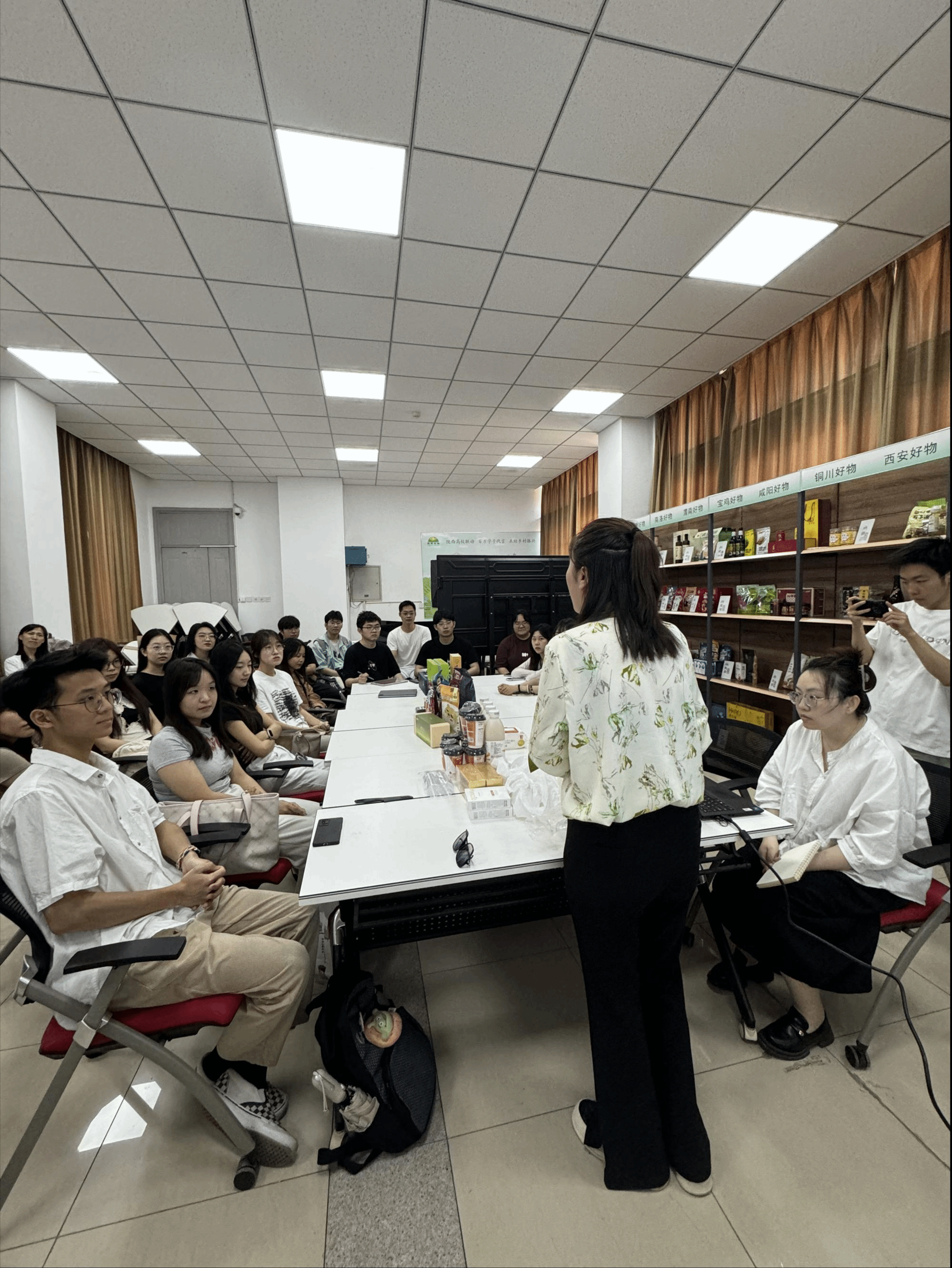 讲解结束后,活动进入高潮——“试吃品鉴”环节。现场准备了多种陕西特色农产品供师生品尝,从甜蜜可口的富平米露,到酥脆的韩城花椒锅巴,再到醇香的曼乔红枣咖啡,每一样特色农产品都赢得了大家的一致好评。师生们在品味中感受农业之美,同时也积极讨论如何通过电子商务手段更好地展现这些农产品的价值,提出了一系列创意十足的营销方案和直播脚本构思。