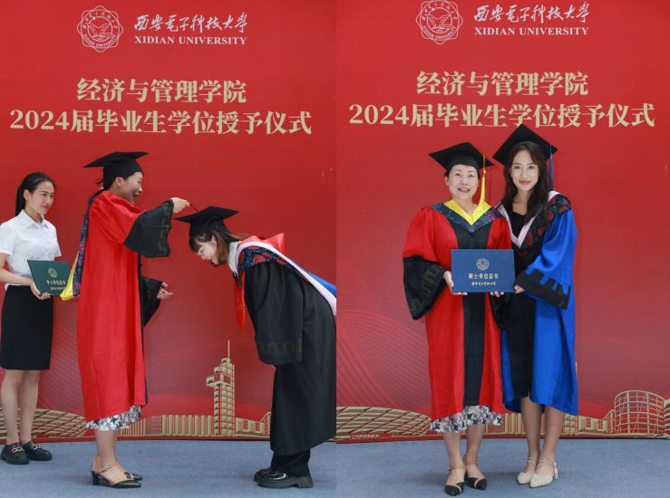 学位授予仪式上,公司领导和老师们作为代表为毕业生拨正流苏并授位,全体毕业生依次上台接受授位并合影留念。这一刻,不仅是学位的传递,更是知识与智慧的传承。