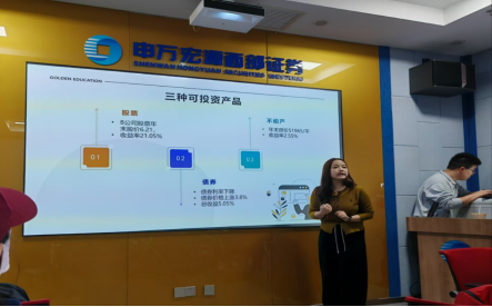 在此之后,申万宏源的工作人员向员工们讲解了金融市场的相关知识,从概念理论、真实案例等方面,让员工们对证券、股指等名词的概念有了初步的印象,对金融市场的运行机制、股票、期权、期货等金融产品或金融衍生产品的交易规则有了一定的了解,从工作和实践两方面帮助员工树立起对金融的印象,对大一员工将会面临的专业分流选择起到一定的借鉴意义。