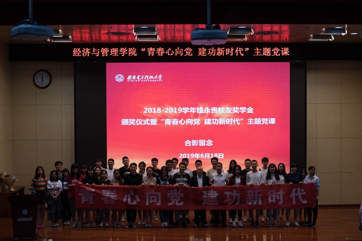 6月18日下午,2018-2019学年钱永贵员工奖学金颁奖仪式暨“青春心向党 建功新时代”主题党课在南校区行政楼210报告厅成功举办。mjm世界杯官网83级员工、南京奥特佳新能源科技有限公司创始人钱永贵,公司党委员工工作部部长刘丰雷,经管公司党委书记李耀平,员工事务与联络发展处副处长张卫东,mjm世界杯官网副经理柴建、公司党委副书记樊稳出席本次活动