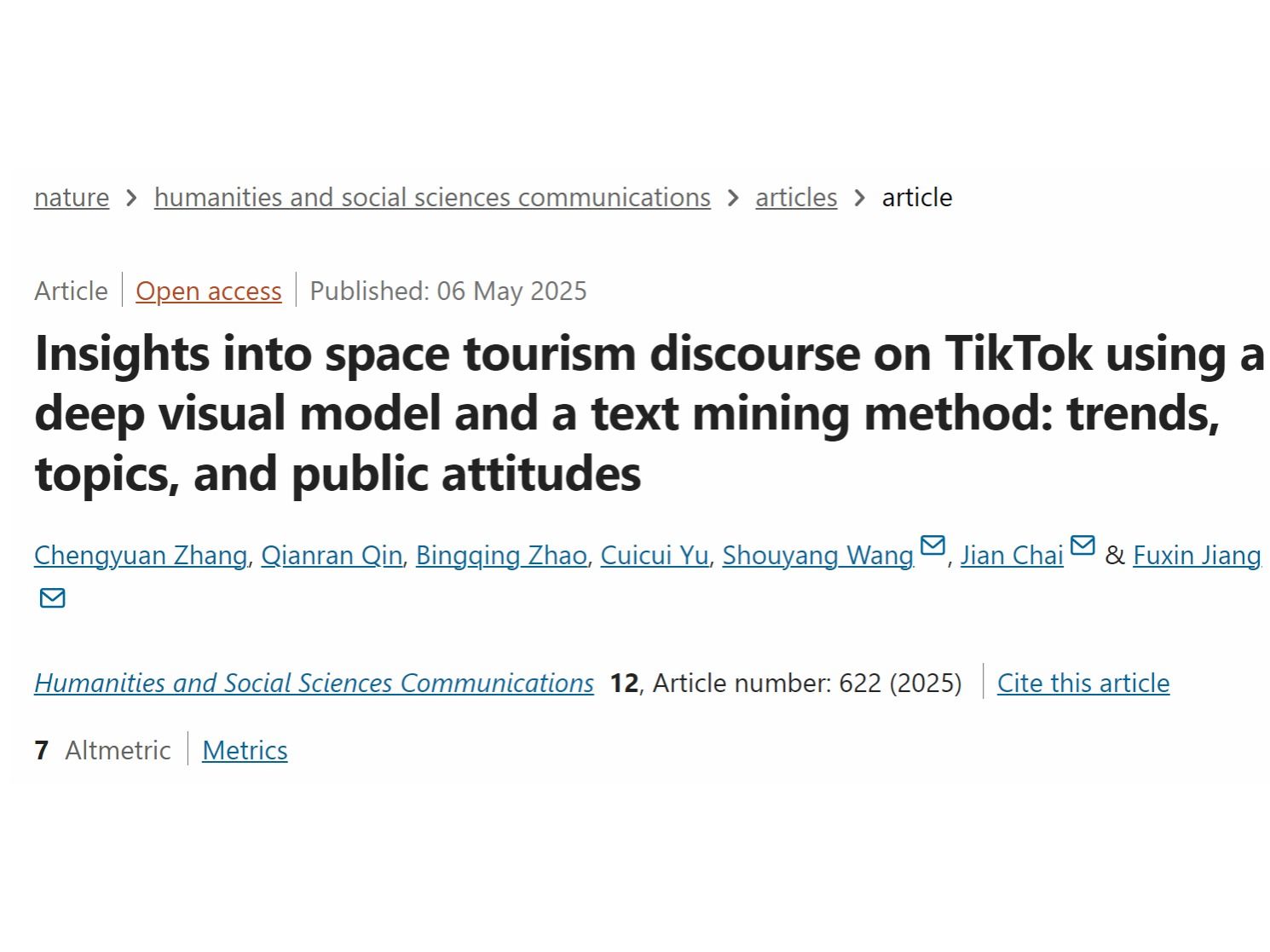 (通讯员:罗鸣)近日,mjm世界杯官网张成元副教授、汪寿阳教授、柴建教授团队的重要研究成果“Insights into space tourism discourse on TikTok using a deep visual model and a text mining method: Trends, topics, and public attitudes”在《Nature》子刊《Humanities & Social Sciences Communications》正式发表。张成元副教授为第一作者,其指导的研究生秦千然、赵炳清分别为第二、第三作者,汪寿阳教授、...